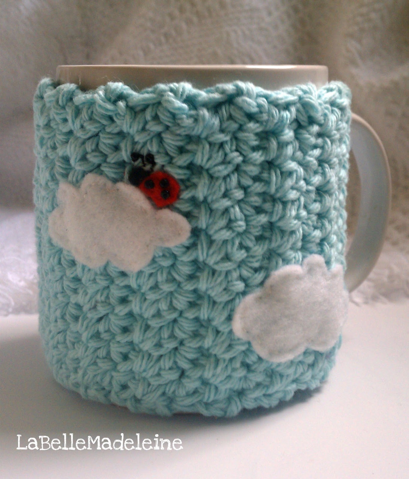 Last night I had this cute inspiration about how to decorate a cozy that I had started last summer (and I forgot about it)... the color made me think of a beautiful sky... so, why not adding some fluffy clouds and, of course, a ladybug crawling on one of those? This is how it came out! Brand new in my shop!
