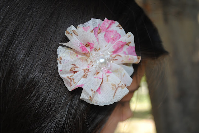 She also has a beautiful ETSY SHOP. She makes adorable hair-clips and head-bands... sooo sooo pretty!!! I have 2 of them and I promised her I would take pics and showed them to the world! Here they are... my girls wearing her clips: